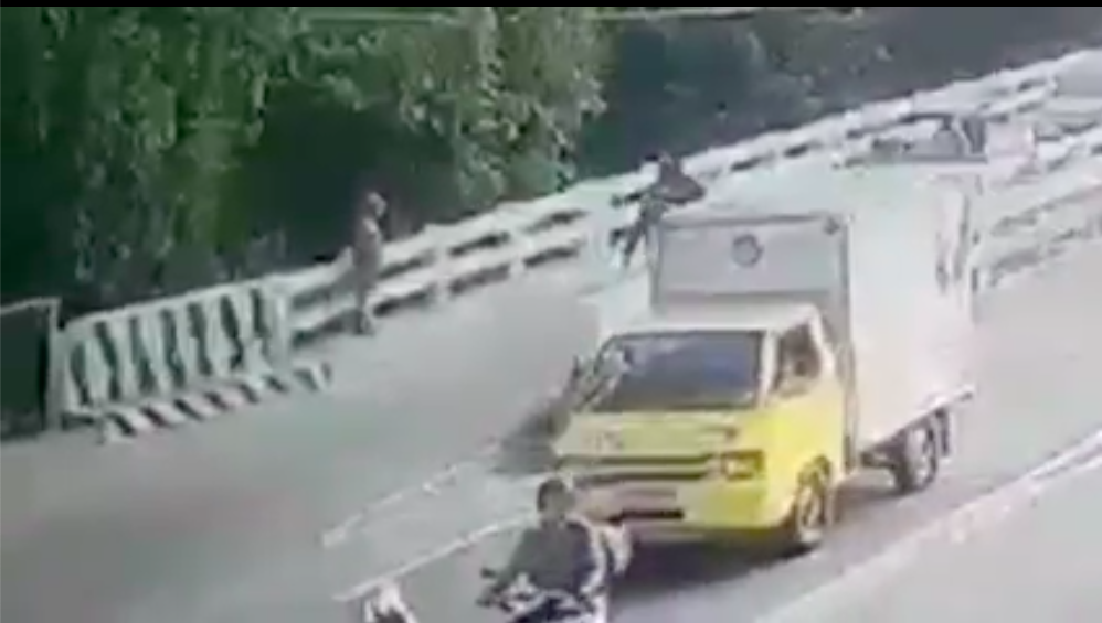 Makikita ang mabilis na pagtakbo ng pulis sa gitna ng highway kahit na maraming sasakyan ang dumaraan upang masagip ang babaeng tatalon sa tulay.