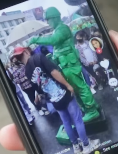 Tila tuloy-tuloy ang pagsikat ng isang street mime performer o kilala sa pangalan na 'Green Man' o 'Green Soldier' na matatagpuan sa City of Pine.