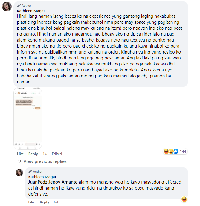 Lantarang hinayag ng customer na si Kathleen Magat sa kanyang Facebook account ang pagkadismaya ng matanggap nito ang inorder na pagkain mula sa isang fast food chain gamit ang isang food delivery app.
